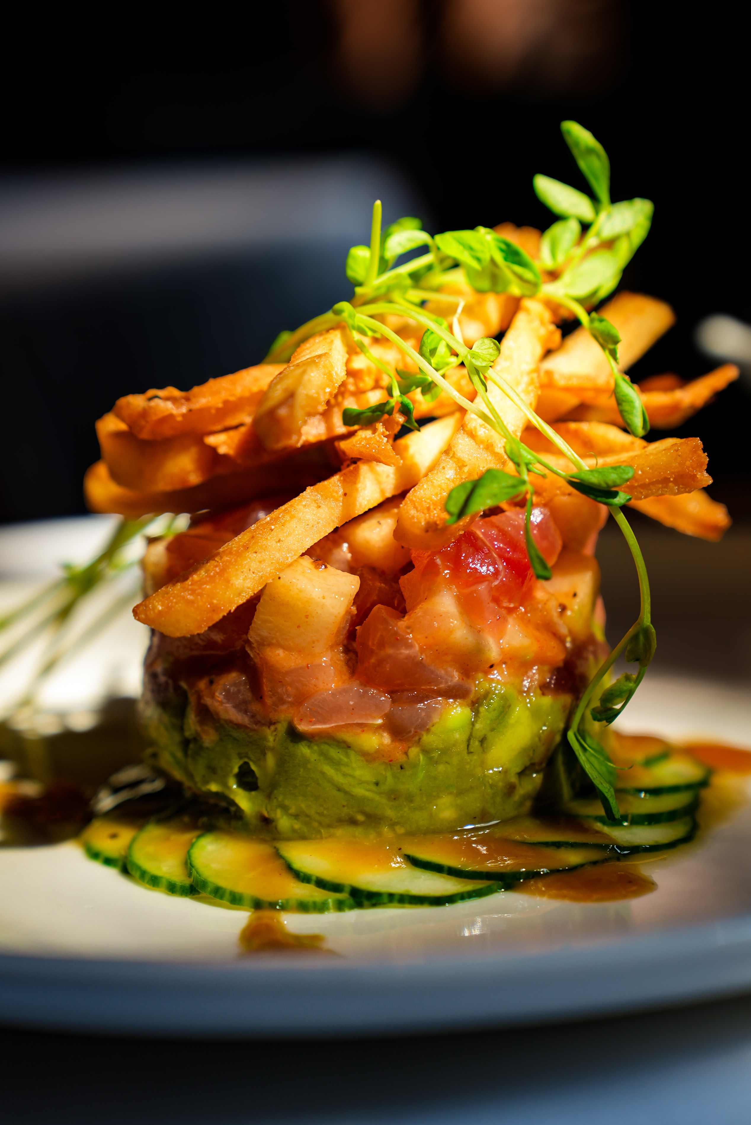 sushi quality tuna, pignoli nuts, avocado, citrus ginger sauce, sliced Persian cucumbers, Asian pear, pita crisps